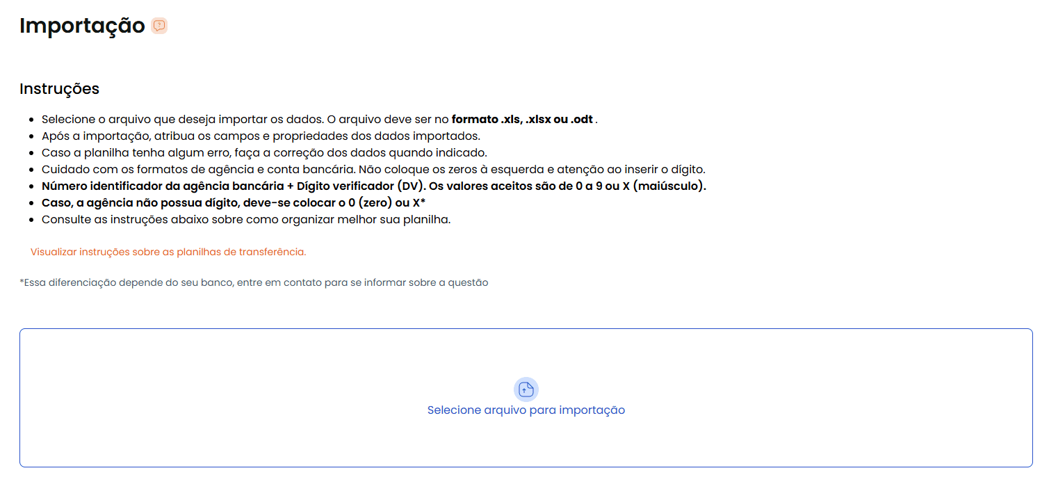Na tela de importação, você terá algunmas instruções para te ajudar neste processo, como o formato permitido para a planilha.