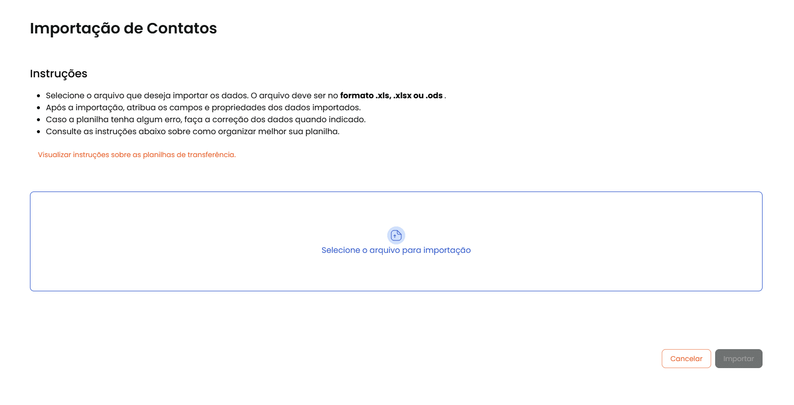 A funcionalidade de Importação de Contatos permite cadastrar vários contatos de uma só vez através de uma planilha. Basta preparar o arquivo, fazer o mapeamento das colunas e confirmar a importação.
